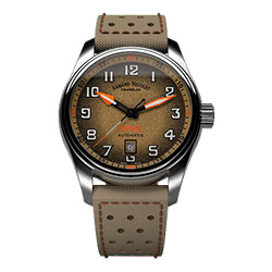 - Производитель объединил классический круглый корпус из нержавеющей стали флагманской коллекции M02 с циферблатом в авиационном стиле, созданным со своеобразной отделкой из вулканического песка. Его цвет разнообразен: центр чуть светлее, а по краям песок будто запекся.