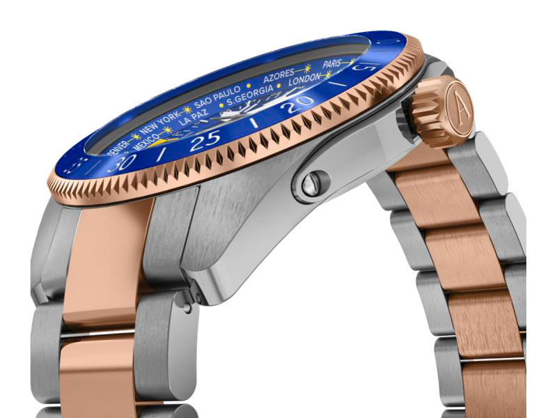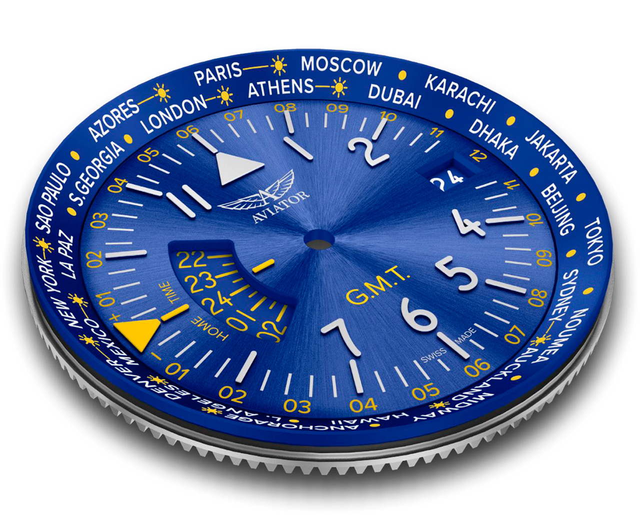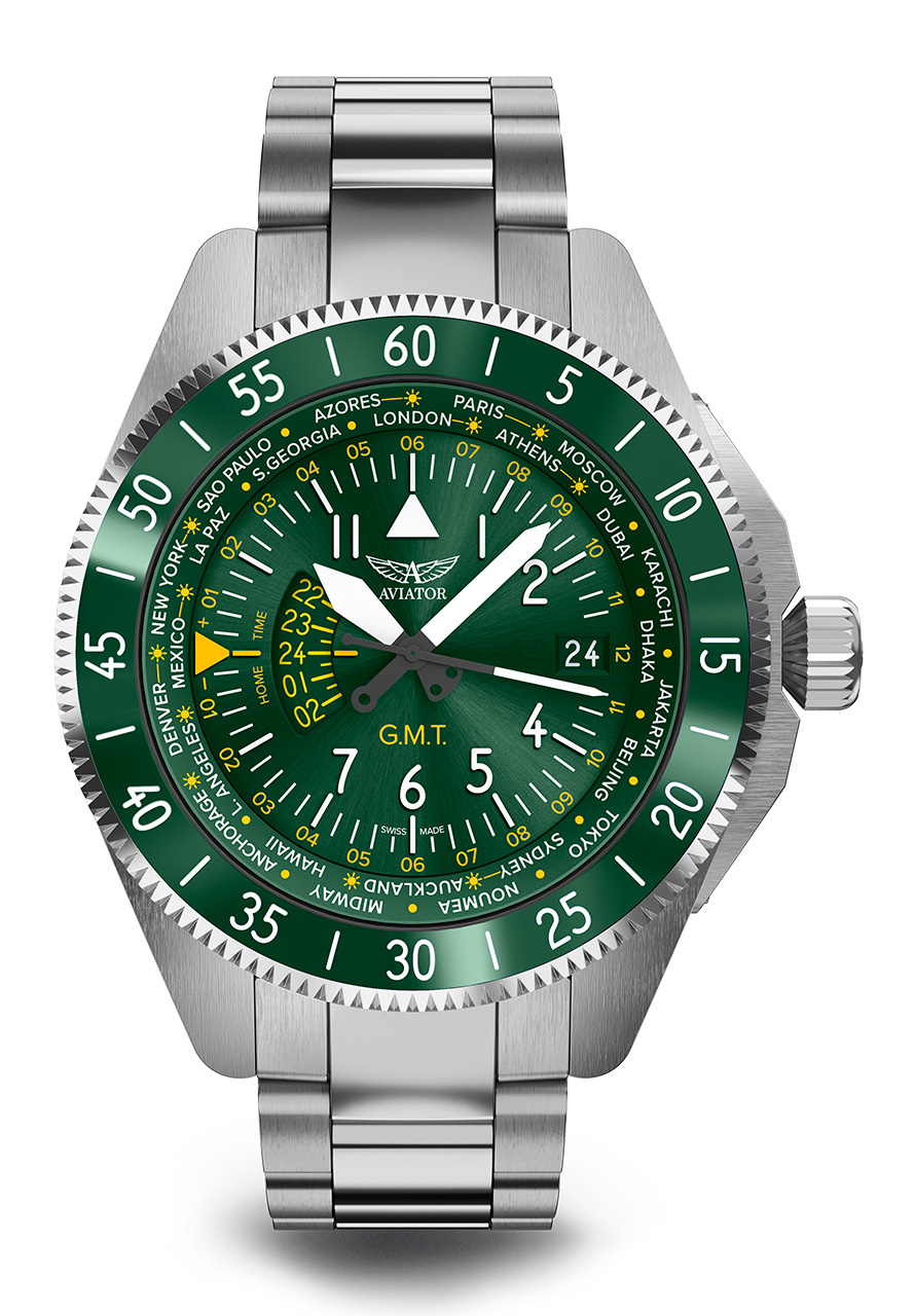 Откройте для себя свежий взгляд на время в любой точке мира вместе с новой моделью Aviator Airacobra Auto. Эта модель оснащена двумя дисплеями, где дисплей второй часовой зоны работает в паре с инновационным вращающемся безелем. Это позволяет владельцу без всяких усилий отслеживать мировое время во всех 24 часовых поясах мира.