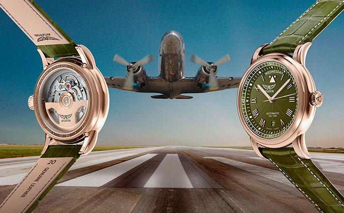 Самолет Douglas DC-3 имеет множество вариантов и моделей, в зависимости от назначения, гражданского производства или военного назначения, двигатели адаптированы и изготовлены на заказ. Компания AVIATOR с новой коллекцией Douglas Day-Date 41 выпустила первый калибр Swiss Made, идеально адаптированный к техническим и эстетическим потребностям. Калибр имеет увеличенный прочный ротор с уникальным дизайном, а календарные диски специально произведены с фирменным винтажным шрифтом и с фоном адаптированным к каждому цвету циферблата.