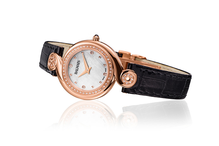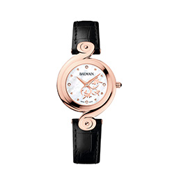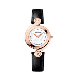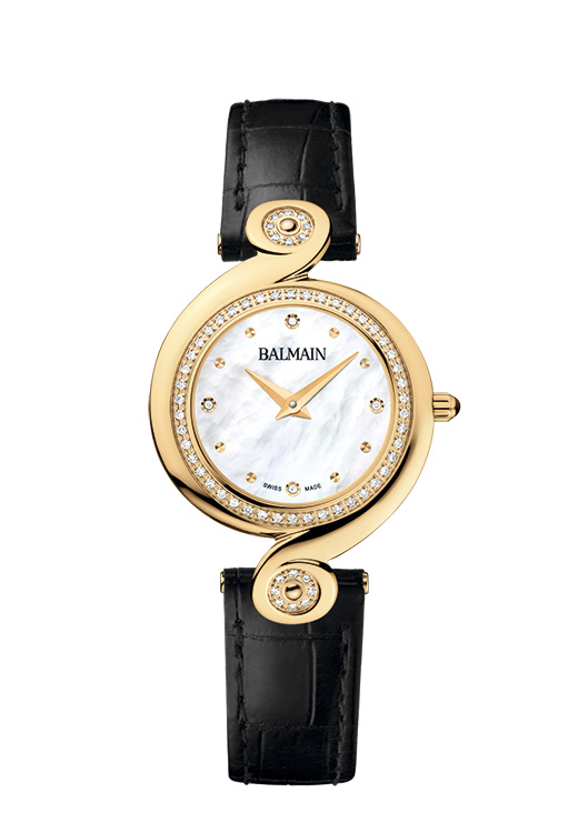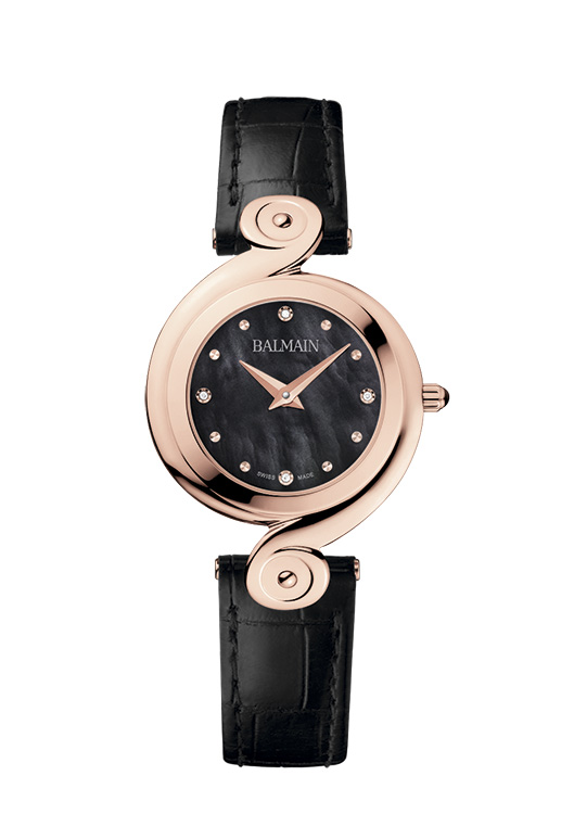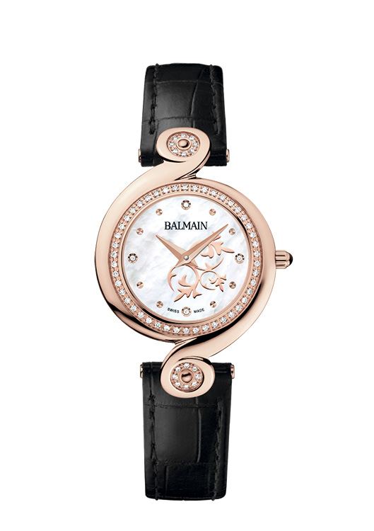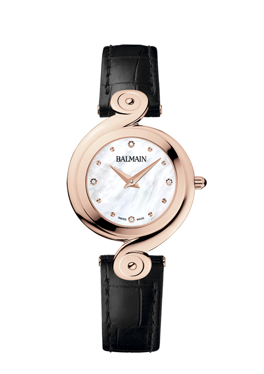 13. Balmain Kerria B4179.32.83 Стальной полированный корпус с розово-золотым PVD-покрытием. Белый перламутровый циферблат с центральными гранёными стальными, с розовой позолотой, стрелками часов и минут, с четырьмя бриллиантами в виде условных индексов, с фирменным розово-золотым узором в форме арабески. Чёрный ремешок из натуральной кожи с застёжкой из стали с розовой позолотой. |