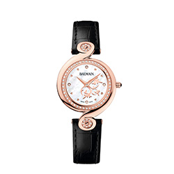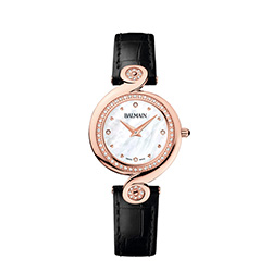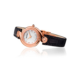 22. Balmain Kerria B4174.32.86 Стальной полированный корпус с розово-золотым PVD-покрытием и шестьюдесятью двумя бриллиантами. Белый перламутровый циферблат с центральными гранёными стальными, с розовой позолотой, стрелками часов и минут, с четырьмя бриллиантами в виде условных индексов. Чёрный ремешок из натуральной кожи с застёжкой из стали с розовой позолотой. |