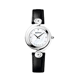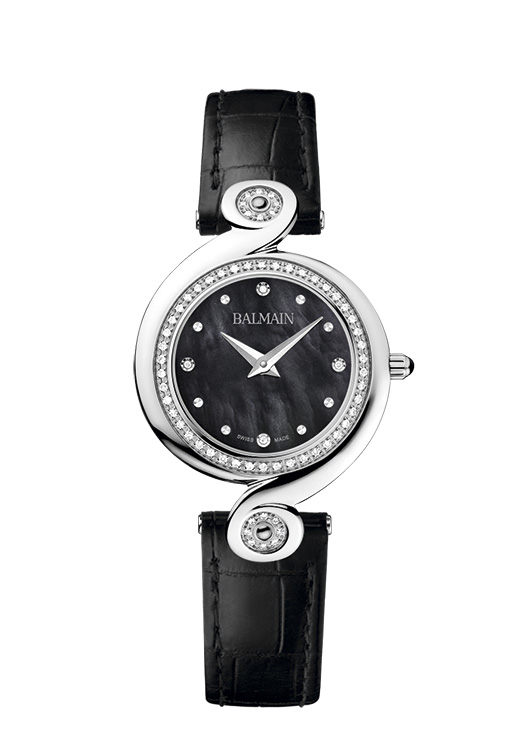 2. Balmain Kerria B4171.32.83 Стальной полированный корпус. Белый перламутровый циферблат с центральными гранёными полированными стальными стрелками часов и минут, с четырьмя бриллиантами в виде условных индексов, с фирменным серебристым узором в форме арабески. Чёрный ремешок из натуральной кожи с полированной стальной застёжкой. |