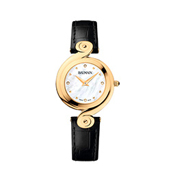 8. Balmain Kerria B4170.32.83 Стальной полированный корпус с жёлто-золотым PVD-покрытием. Белый перламутровый циферблат с центральными гранёными стальными, с жёлтой позолотой, стрелками часов и минут, с четырьмя бриллиантами в виде условных индексов, с фирменным жёлто-золотым узором в форме арабески. Чёрный ремешок из натуральной кожи с застёжкой из стали с жёлтой позолотой. |
