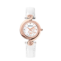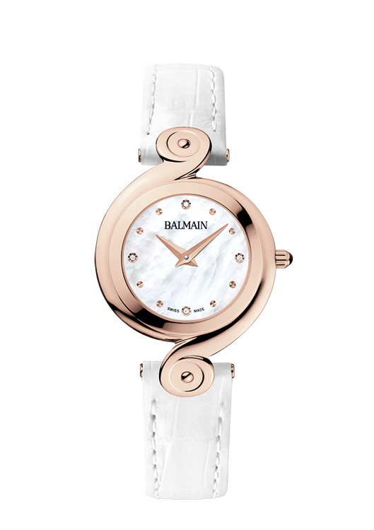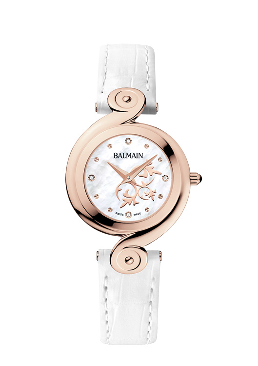 10. Balmain Kerria B4179.22.83 Стальной полированный корпус с розово-золотым PVD-покрытием. Белый перламутровый циферблат с центральными гранёными стальными, с розовой позолотой, стрелками часов и минут, с четырьмя бриллиантами в виде условных индексов, с фирменным розово-золотым узором в форме арабески. Белый ремешок из натуральной кожи с застёжкой из стали с розовой позолотой. |