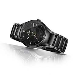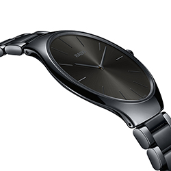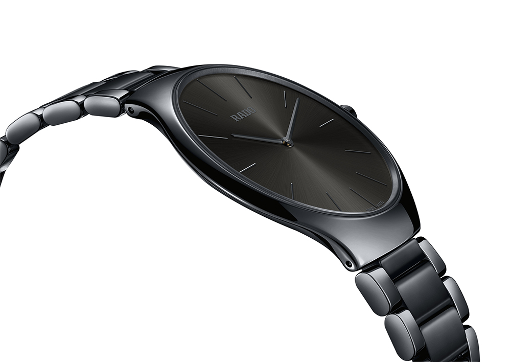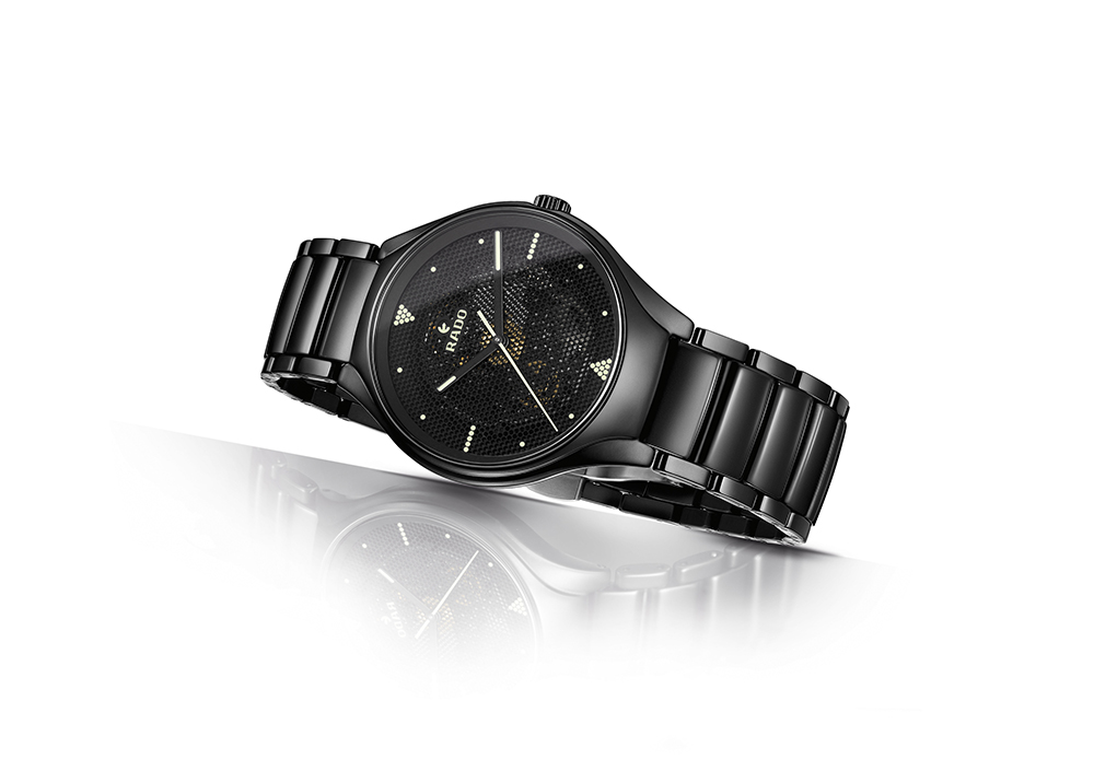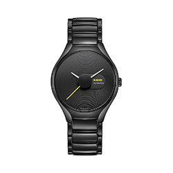 Rado True Stratum разработаны вместе с ведущим австрийским дизайнером Райнером Мутшем. Черный циферблат отличается изящными асимметрично расположенными ступенями, которые подчеркивают трехмерность вогнутой поверхности. Матово-родиевые часовая и минутная стрелки и желтая секундная стрелка создают цветовой эффект и обеспечивают хорошую видимость.