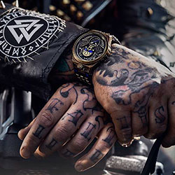 Storm Rider - это не просто часы, а полноценный стиль жизни. Уникальная конструкция с заводной головкой на позиции «12 часов» обеспечивает комфорт при ношении, особенно в перчатках или на мотоцикле. Прочный браслет из кожи и нейлона с клепками и фирменной прострочкой добавляет харизмы, а гравировка с изображением скелета-байкера на задней крышке завершает эффектный образ.