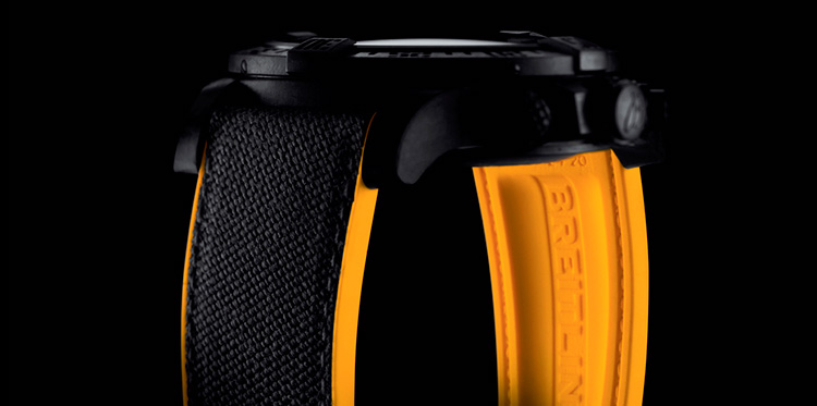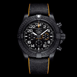 | 1. Breitling Avenger Hurricane XB1210E4/BE89-257S: матовый чёрный корпус из инновационного полимера «Breitlight®»; чёрный циферблат; ремешок «Diver Pro» из жёлтого каучука и высокопрочного текстиля «Military» цвета антрацит с раскладывающейся застёжкой. | |