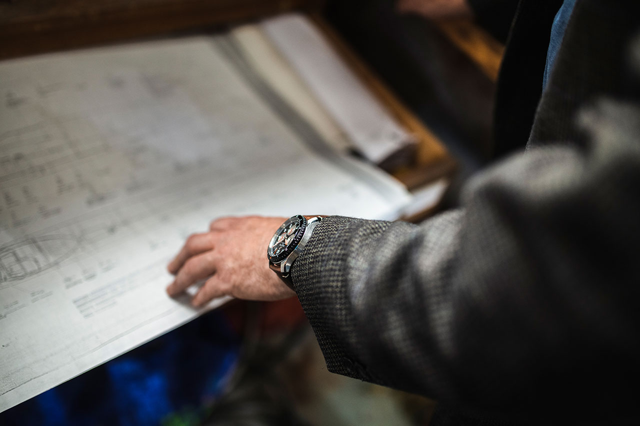 На яркую центральную часовую стрелку оранжевого цвета, а также минутную и центральную секундную стрелки нанесено люминесцентное покрытие по технологии Super-LumiNova®, которое гарантирует удобство считывания времени при любом уровне освещенности. Динамичные красно-оранжевые акценты напоминают опознавательные знаки на фюзеляже самолетов de Havilland Mosquito и подчеркивают уникальный характер модели. Стрелка малого секундного счетчика покрыта черным лаком. На циферблате в положении между «4» и «5» часами находится окошко индикации даты.