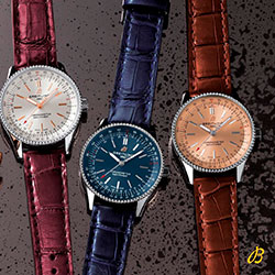Ценительницам изящных часов также предлагается версия в корпусе из 18-каратного розового золота с белым перламутровым циферблатом и бриллиантовыми часовыми метками. Великолепные часы дополняет ремешок из кожи аллигатора коричневого цвета с классической или раскладной застежкой из 18-каратного розового золота либо браслет Navitimer, изготовленный из 18-каратного розового золота, с клипсой-бабочкой. Стоит отметить, что к любой из версий могут быть дополнительно приобретены ремешки из кожи аллигатора необычных цветов – зеленого и золотистого.