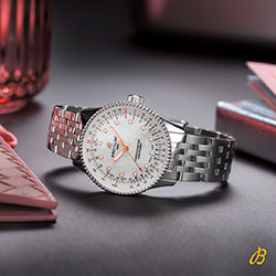 Второй вариант – 35-миллиметровый корпус с циферблатом из белого перламутра и бриллиантовыми часовыми метками. Ремешок из кожи аллигатора выполнен в бордовом цвете, имеет классическую или раскладную застежку. В данном случае часы также могут быть представлены с браслетом Navitimer из нержавеющей стали с раскладной застежкой.