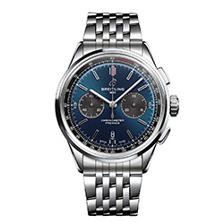 Модели линейки Premier B01 Chronograph 42, оснащенные мануфактурным калибром Breitling Manufacture Caliber 01, являются флагманами новой коллекции. Практика подтвердила, что калибр Breitling Caliber 01, разработанный полностью специалистами компании Breitling, является одним из самых эффективных часовых механизмов в мире. Хронограф с автоподзаводом, сертифицированный Швейцарским институтом официального тестирования хронографов, обладает впечатляющим запасом хода свыше 70 часов. Модель Breitling Premier B01 Chronograph 42 выполнена в прочном корпусе из нержавеющей стали диаметром 42 миллиметра с прозрачной задней крышкой и поставляется в вариантах с синим или серебристым циферблатом. Версия с синим циферблатом предлагает на выбор либо синий ремешок из кожи аллигатора, либо коричневый ремешок из нубука с белой прострочкой, либо с браслетом из нержавеющей стали. Модель с серебристым циферблатом поставляется с черным ремешком из нубука или кожи аллигатора, либо с браслетом из нержавеющей стали.