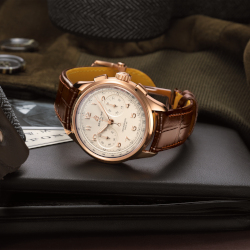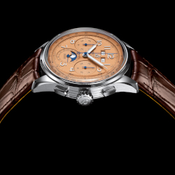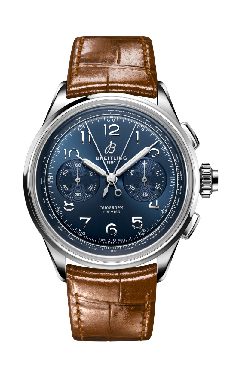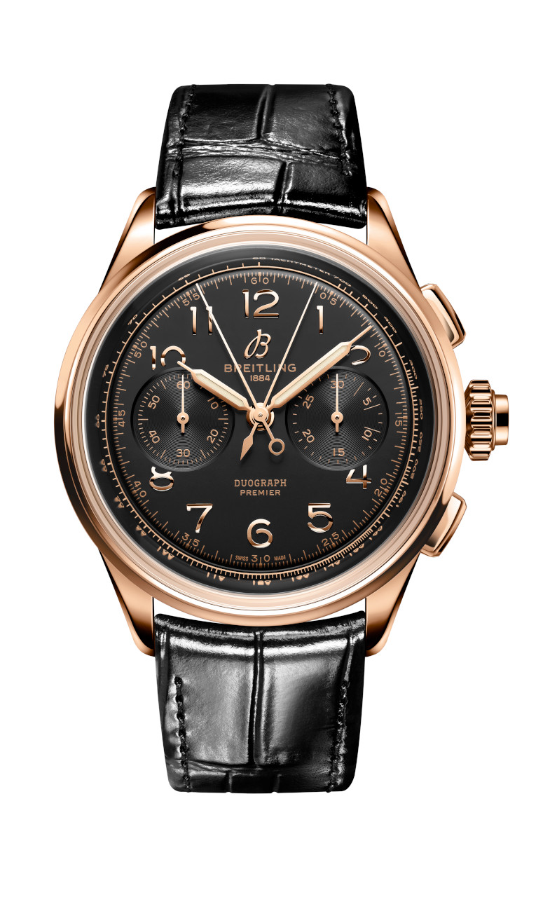 Модель Premier Heritage Duograph выпускается с синим или черным циферблатом в корпусе диаметром 42 мм из нержавеющей стали и 18-каратного красного золота соответственно. Ее функция сплит-хронографа – одна из самых сложных в часовом деле – позволяет владельцу измерять одновременно два отрезка времени с помощью двух центральных стрелок хронографа. Эта модель оснащена мануфактурным калибром Breitling B15 с ручным подзаводом, созданным на основе мануфактурного калибра Breitling B03.