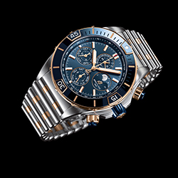 Циферблат синего цвета со счетчиками хронографа в тон.