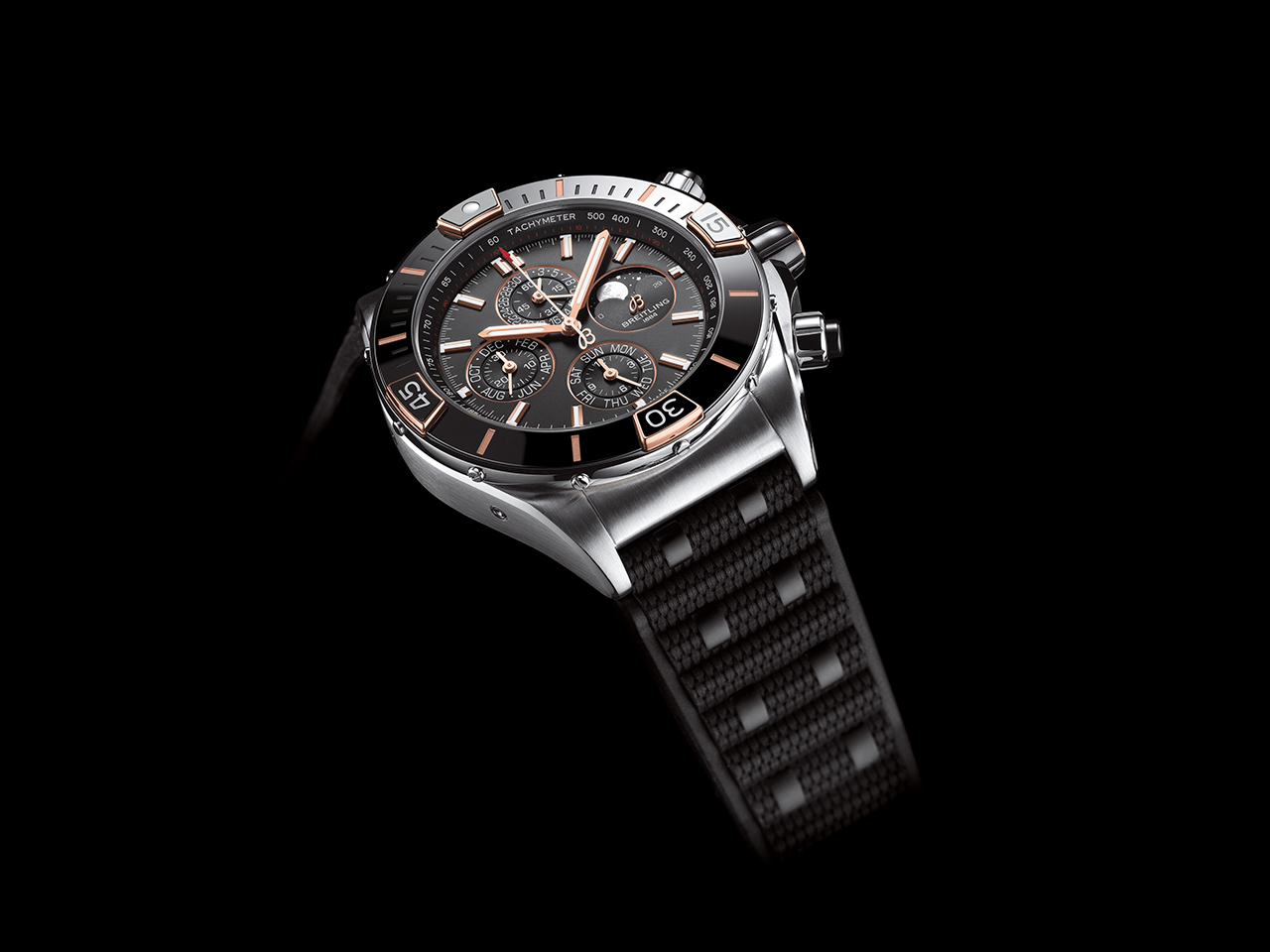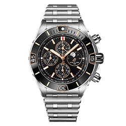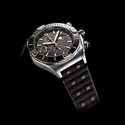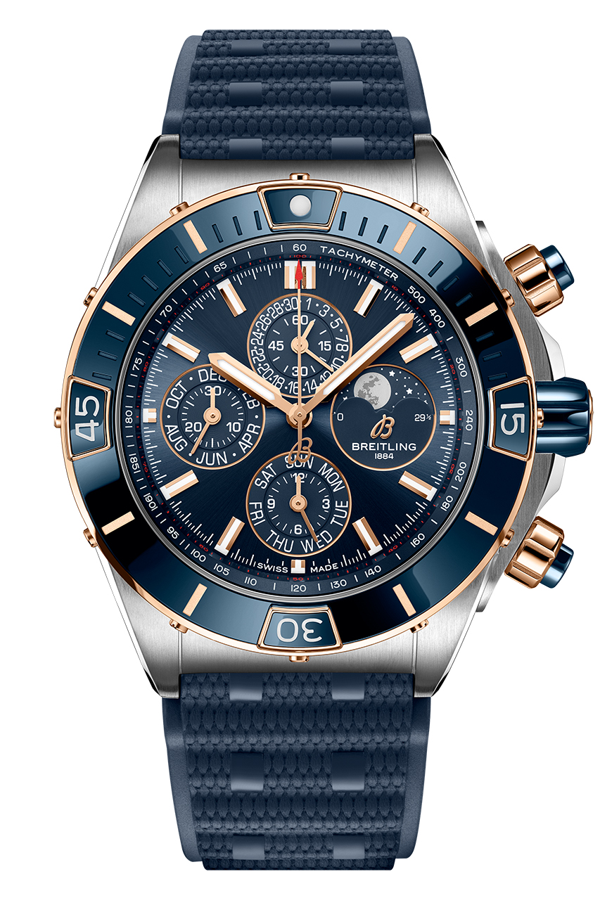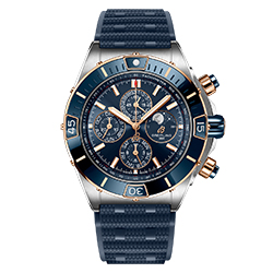 Как и в оригинальной версии Chronomat, райдеры защищены сапфировым стеклом. Те, что расположены у отметок «3 часа» и «9 часов», взаимозаменяемы, поэтому их можно использовать как для обратного, так и для прямого отсчета времени. Смелый характер коллекции Super Chronomat подчеркивается диаметром корпуса 44 мм. В новой модели реализованы такие нововведения, как безель из нержавеющей стали с керамической инкрустацией (впервые в Chronomat) и возможность выбора ремешка – каучукового в стиле Rouleaux или оригинального металлического с клипсой-бабочкой. Новый каучуковый ремешок создан с использованием новейшей технологии литья под давлением. Представлены три варианта текстуры – матовая, глянцевая и в стиле плетения – они придают модели особый стиль.