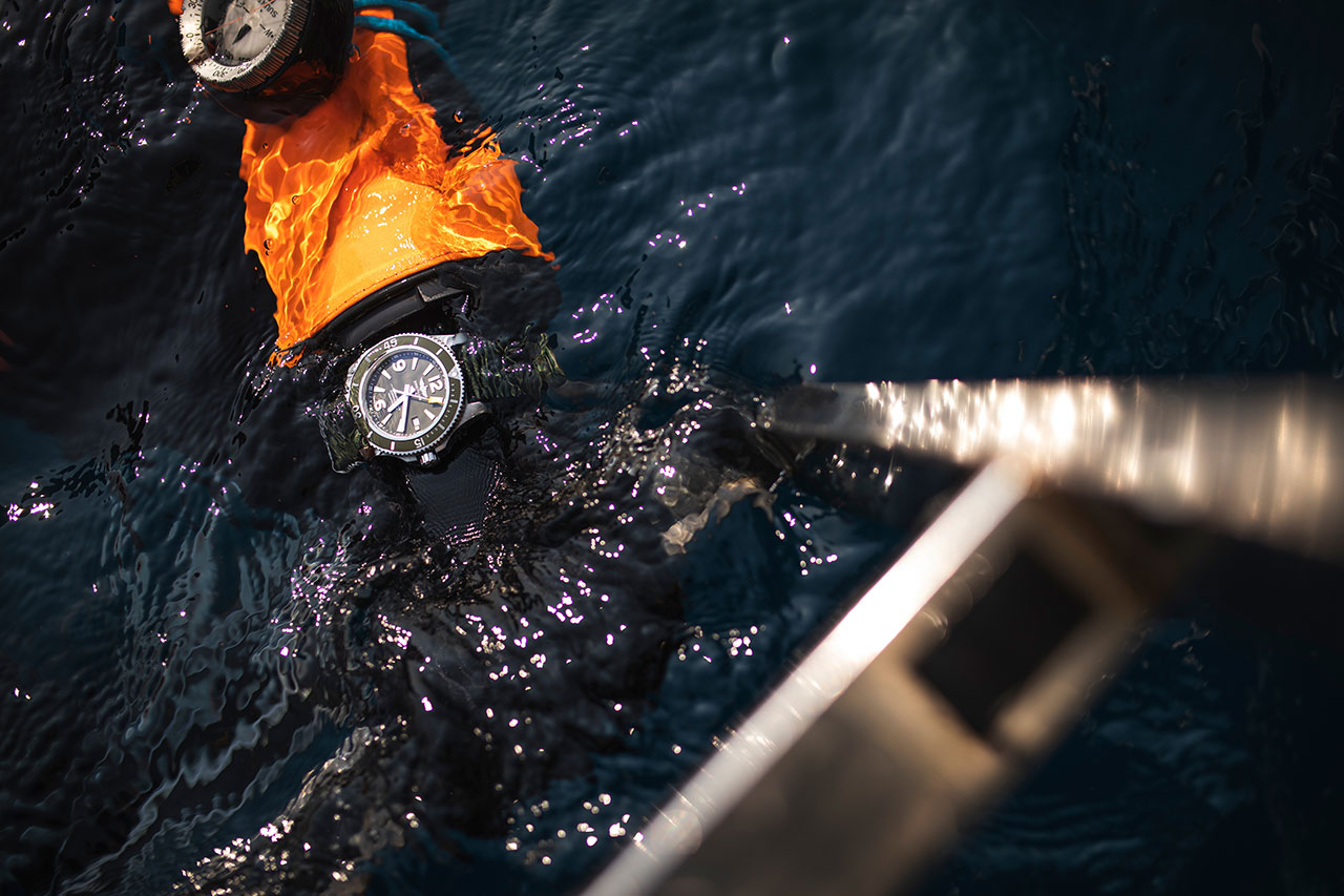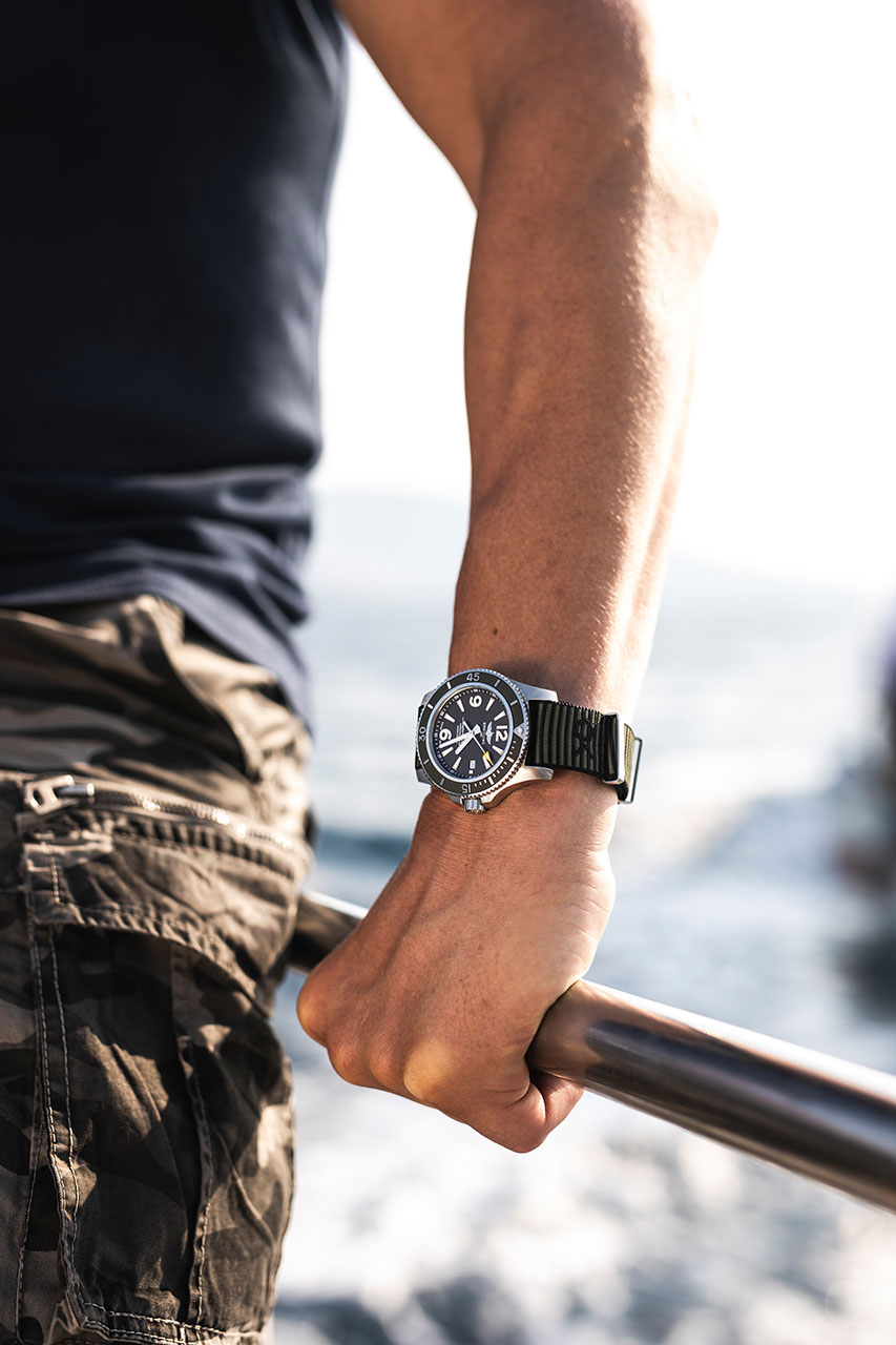 Главной особенностью Superocean Outerknown является уникальный ремешок цвета хаки. Он изготовлен из инновационного материала ECONYL®, который производят из переработанных нейлоновых отходов, в том числе остатков использованных рыболовных сетей, найденных в морях и океанах.