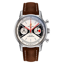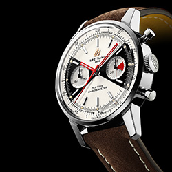 Внутри корпуса из нержавеющей стали диаметром 41 мм находится механизм с функцией хронографа Breitling Caliber 23, запас хода которого составляет около 48 часов. Его высокая точность подтверждена сертификатом Швейцарского института официального тестирования хронометров (COSC). На часовую и минутную стрелки красного цвета, а также круглые часовые метки нанесено люминесцентное покрытие по технологии Super-LumiNova®, что позволяет считывать показания времени при любом уровне освещенности. Помимо трех центральных стрелок (часовой, минутной и секундной стрелки хронографа) циферблат оснащен десятичной шкалой и двумя малыми счетчиками. Один из них, секундный, размещен напротив отметки «9 часов», а второй, 30-минутный, с необычными акцентами красного цвета – напротив отметки «3 часа». Коричневый ремешок из нубука напоминает об истории создания модели и подчеркивает ее ретростилистику. Эти уникальные часы выпущены ограниченной серией в 2000 экземпляров. На задней крышке корпуса каждого из них выгравирована надпись «ONE OF 2000».