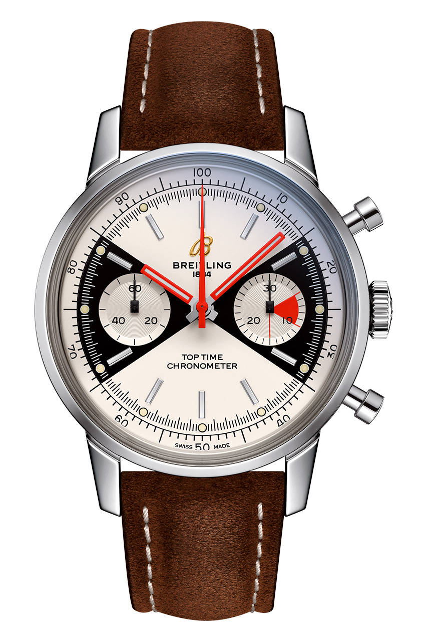 «Мы разрабатываем превосходные ультрасовременные хронографы. Главные часы этой линейки – абсолютно новая модель Top Time», – говорил Брайтлинг о новинке бренда того времени. Благодаря спортивному характеру эти часы привлекли внимание не только молодых мужчин, но и женщин, оценивших смелый дизайн и элегантность модели. Сегодня компания Breitling дарит поклонникам бренда обновленный хронограф Top Time. Его предшественник обладал одним из самых оригинальных циферблатов за всю историю часового дела и тем самым завоевал признание многих коллекционеров.