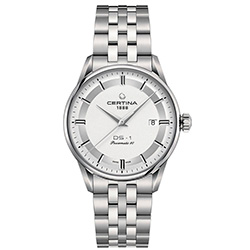 | 7. Certina DS-1 Powermatic 80 C029.807.11.031.00: корпус из нержавеющей стали, серебристый циферблат с никелированными стрелками и условными индексами, прозрачная задняя крышка, 5-рядный браслет из нержавеющей стали. | |