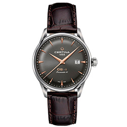 | 3. Certina DS-1 Powermatic 80 C029.807.16.081.01: корпус из нержавеющей стали, тёмно-серый (антрацитовый) циферблат, стрелки и условные индексы с PVD-покрытием из розового золота, прозрачная задняя крышка, тёмно-коричневый кожаный ремешок. | |