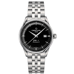 | 6. Certina DS-1 Powermatic 80 C029.807.11.051.00: корпус из нержавеющей стали, чёрный циферблат с никелированными стрелками и условными индексами, прозрачная задняя крышка, 5-рядный браслет из нержавеющей стали. | |