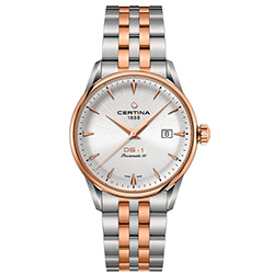 | 8. Certina DS-1 Powermatic 80 C029.807.22.031.00: корпус из нержавеющей стали, безель и заводная головка с PVD-покрытием из розового золота; серебристый циферблат, стрелки и условные индексы с PVD-покрытием из розового золота, прозрачная задняя крышка, 5-рядный браслет из нержавеющей стали с чётными рядами, отделанными PVD-покрытием из розового золота. | |