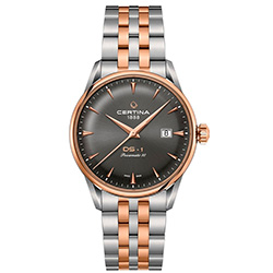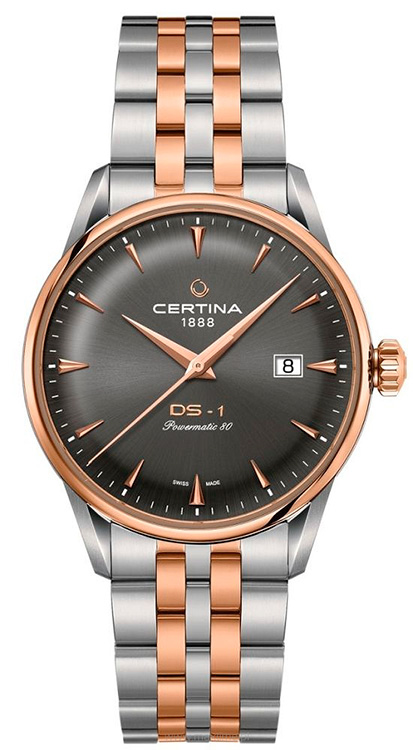 | 9. Certina DS-1 Powermatic 80 C029.807.22.081.00: корпус из нержавеющей стали, безель и заводная головка с PVD-покрытием из розового золота; тёмно-серый (антрацитовый) циферблат, стрелки и условные индексы с PVD-покрытием из розового золота, прозрачная задняя крышка, 5-рядный браслет из нержавеющей стали с чётными рядами, имеющими отделку PVD-покрытием из розового золота. |