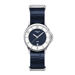 - C039.251.17.047.00 Белый безель, синий циферблат, ремешок из экологичного материала.