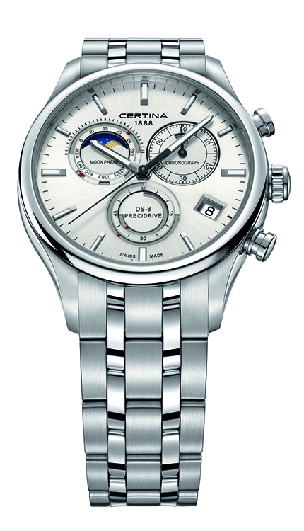 Швейцарская часовая марка «Certina» продолжает совершенствовать хронограф «DS-8». Новая версия хронографа была впервые продемонстрирована в числе главных премьер ежегодной международной выставки часов и ювелирных изделий «Baselworld 2015», а в настоящее время обновлённый хронограф доступен в продаже. Часы «Certina DS-8 Chronograph Moon Phase» имеют благородный, лишённый вычурности, дизайн, а к его функциям добавлена индикация лунных фаз. Новинка вариативна по цветовому исполнению, проста в управлении и, безусловно, надёжна в использовании.