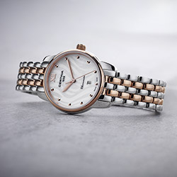 Новая женская модель DS-8 Lady от Certina представлена в изысканном корпусе из нержавеющей стали диаметром 27,5 мм с PVD-покрытием цвета розового золота. Элегантный дизайн дополняют стрелки, часовые отметки и двухцветный металлический браслет из пяти рядов полированных звеньев. Белый перламутровый циферблат служит идеальным холстом для стильного декора из тонких округлых линий.