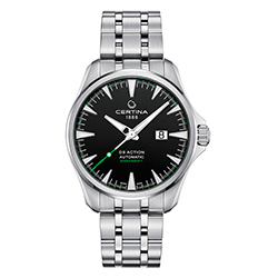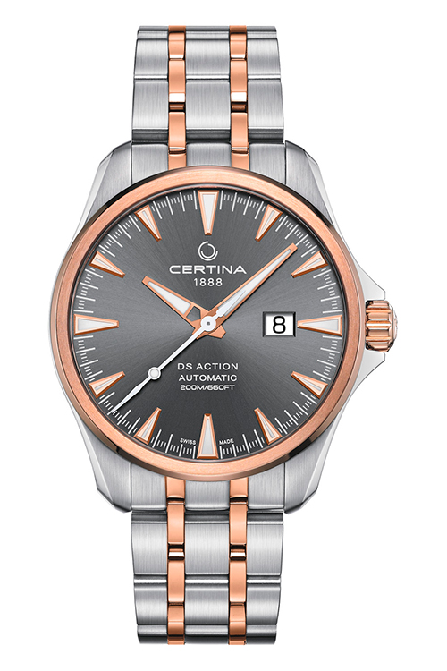 Компания Certina представляет новую модель DS Action Big Date Automatic с впечатляющими возможностями. Среди них эффектное большое окошко даты или часовые отметки и стрелки с покрытием Super-LumiNova, водонепроницаемость до 20 бар, сверхпрочная конструкция.