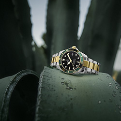 Название часов говорит само за себя – DS Action Diver всегда готовы к любому виду активной деятельности. Они станут надежным спутником как на рабочем совещании, так и в бассейне или на торжественном ужине. Универсальность модели подчеркивает ее элегантное исполнение в спортивном стиле в сочетании с характеристиками ультрапрочных часов для подводных погружений. Черный лакированный циферблат оснащен золотистыми часовыми отметками и стрелками с покрытием Super-LumiNova®, обеспечивающими прекрасную считываемость показаний даже в темноте. Циферблат обрамлен однонаправленно вращающимся безелем из алюминия изумрудно-зеленого оттенка, дополненным золотистой шкалой для отсчета времени погружения и люминесцентными отметками. Двухцветный браслет из нержавеющей стали со звеньями с золотистым PVD-покрытием и застежка с удлинением для дайвинга завершают образ этой модели.