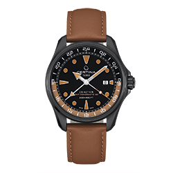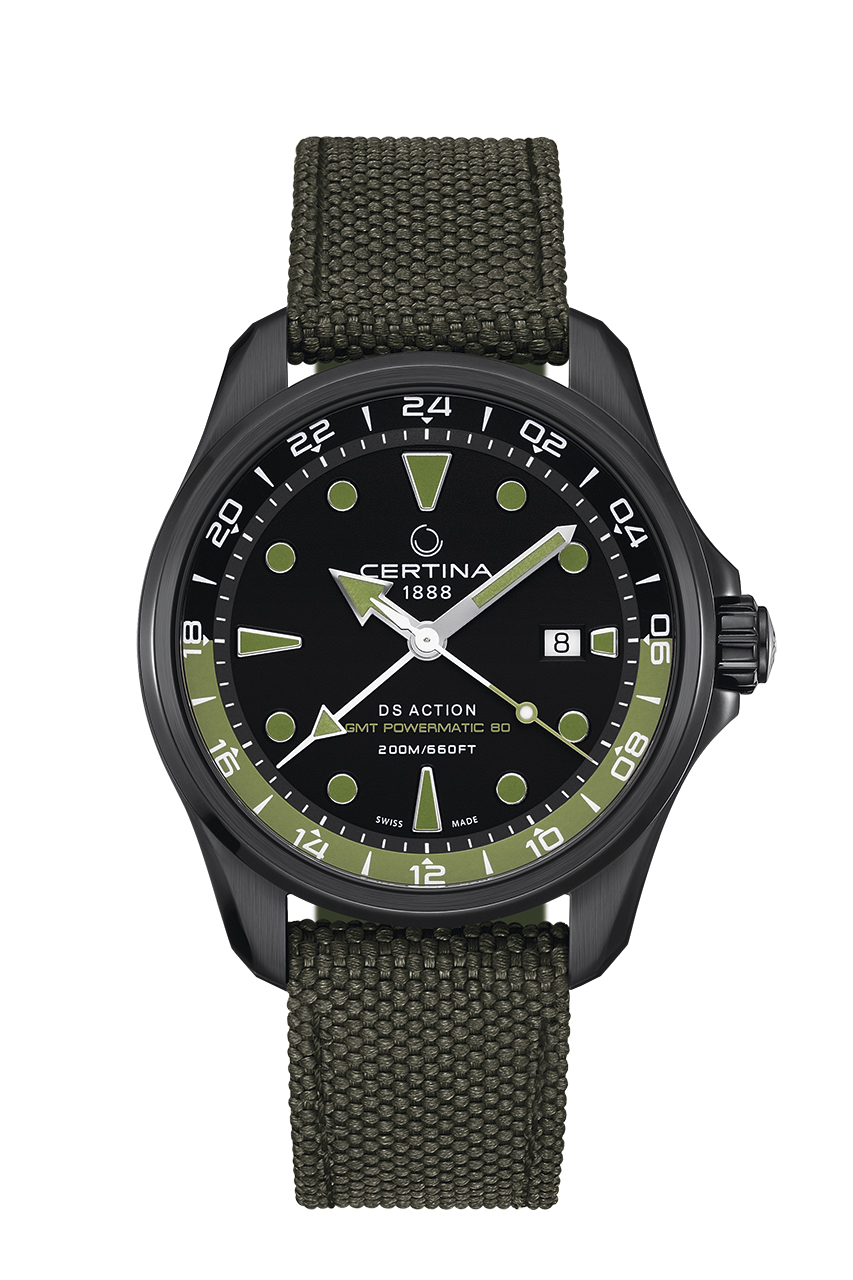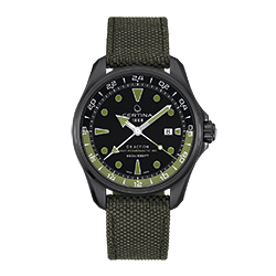 Корпус диаметром 43 мм из нержавеющей стали с черным PVD-покрытием скрывает автоматический калибр Powermatic-80 с запасом хода до 80 часов. Стрелки и часовые отметки с покрытием Super-LumiNova® зеленого цвета четко различимы на матовом черном циферблате даже в темноте. Отдельная стрелка и 24-часовая шкала позволяют легко считывать показания времени второго часового пояса. Спортивный характер и надежную конструкцию часов подчеркивает текстильный ремешок цвета хаки с классической застежкой. Также доступны варианты исполнения в черном корпусе с PVD-покрытием, с акцентами коричневого цвета и кожаным ремешком, либо стальным браслетом, а также с черным циферблатом с зелеными или красными акцентами.