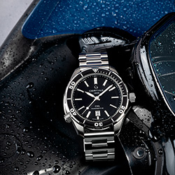 Комплект Aqua&Sport является воплощением динамичного дизайна. Черный циферблат с гильоше «солнечные лучи» комбинируется с корпусом часов для дайвинга с черным однонаправленно вращающимся безелем и его спортивной версией с удлиненными боковыми гранями и шестью винтами. Обе модели дополнены черно-серым тканевым ремешком из материала #tide ocean material® и трехрядным металлическим браслетом.