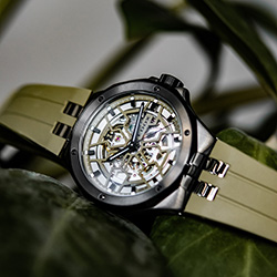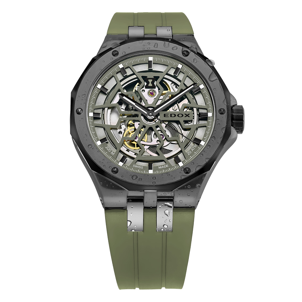 Часы Delfin Mecano от Edox стали настоящим хитом среди любителей часов по всему миру. Теперь бутик швейцарского часового производителя расширяет семейство Delfin Mecano новой моделью, выполненной в изысканной прохладной цветовой гамме. Сочетание грифельно-серого безеля и выступов в сочетании с ремешком цвета мха и скелетонизированными вставками на циферблате создает на запястье смелый, но утонченный вид часов.
