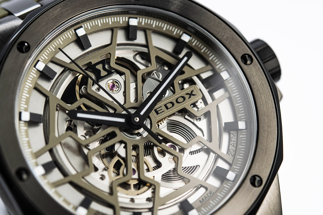 Скелетонизированный дизайн позволяет владельцу мельком увидеть завораживающие, сложные движения автоматического механизма калибра 853. И даже находясь под водой или при слабом освещении, Delfin Mecano обеспечивает кристально четкое отображение времени благодаря покрытию SuperLuminova на стрелках и индексах. 12-гранный безель Delfin Mecano повторяет форму классических моделей Delfin 70-х годов и является напоминанием о том, что хотя Edox постоянно расширяет границы часового дела, она всегда помнит о своем наследии.