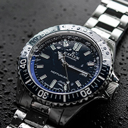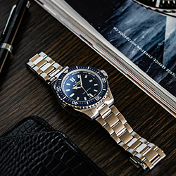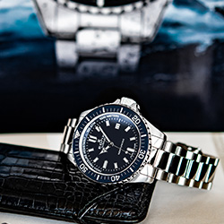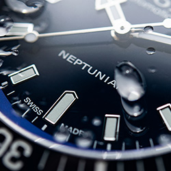 Вы никогда не пропустите морской пейзаж благодаря темно-синему циферблату, который напоминает о цветах океана и его необъятности. Стрелки и индексы Neptunian с покрытием Super-LumiNova X1 обеспечивают читаемость при слабом освещении или под водой. Встроенный гелиевый выпускной клапан гарантирует, что автоматический механизм Neptunian Calibre 80 с 38-часовым запасом хода не пропустит ни одного удара, даже находясь глубоко под волнами.