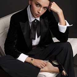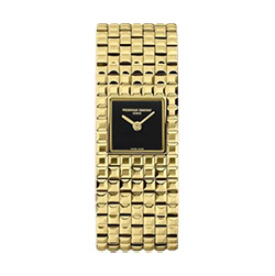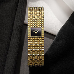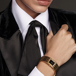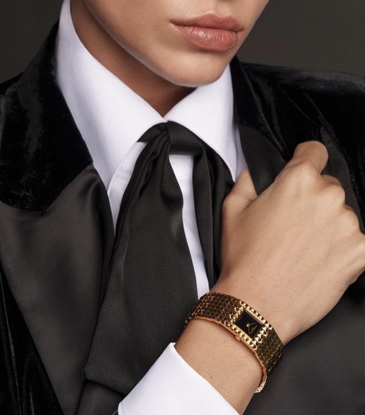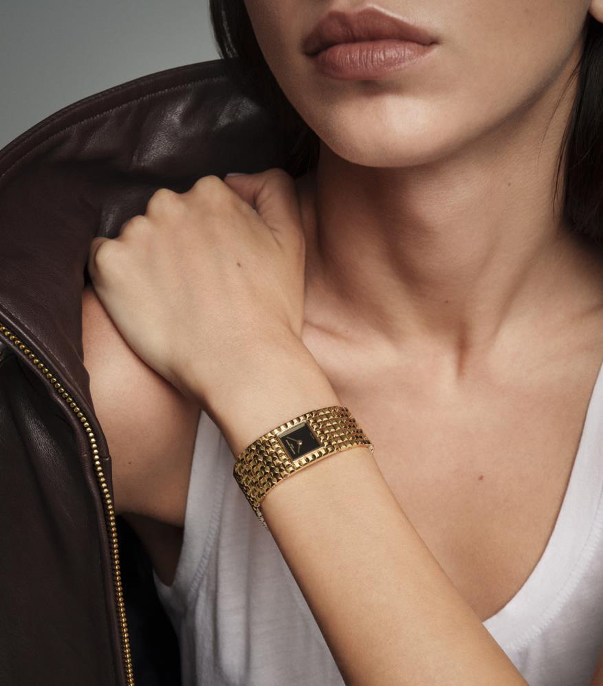 Миниатюрный квадратный циферблат интегрирован в браслет и отображает только часы и минуты. Такое решение подчёркивает декоративную функцию изделия, при этом сохраняя базовую функциональность часов.