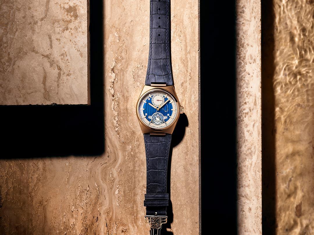 Открытый циферблат демонстрирует элегантное и насыщенное голубое украшение Côtes de Genève, подчеркивающее 30-й внутренний механизм бренда, которым также можно любоваться через заднюю крышку из хрусталя. В соответствии с лучшими традициями часового дела это замечательное творение имеет фаски на мостиках, которые отполированы вручную. Этой степенью отделки до сих пор могут похвастаться лишь немногие часовые производства.