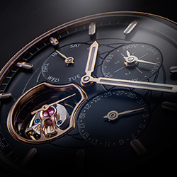 Циферблат часов разработан с учетом максимальной функциональности и считываемости. Отображение дня, числа и месяца на отметках «12-3-9», дополненное стрелкой, а также индикация високосного года и турбийон, демонстрирующий техническое мастерство, делают эту модель часов исключительной как внутри, так и снаружи.