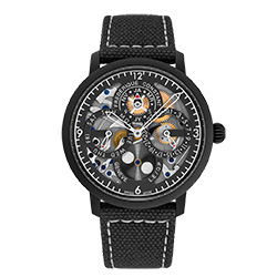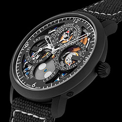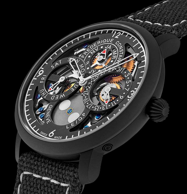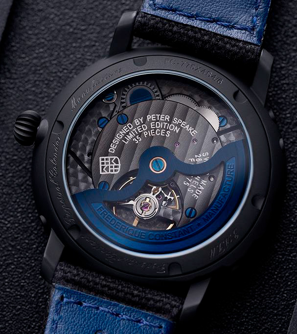 В этой ограниченной серии, насчитывающей всего 35 экземпляров, все элементы часов выполнены в строгом черном цвете. Черный корпус, ремешок и ажурный циферблат подчеркивают утонченную работу механизма FC-775, демонстрируя сочетание женевского мастерства и британской дерзости. Сатинированные детали, вороненые винты и сапфировое стекло на задней крышке делают эту модель воплощением высокого часового искусства, что делает эту модель коллекционной.
