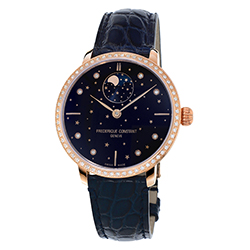 Компания Frederique Constant верна своим традициям при создании новой модели. Часы отличаются элегантностью и техническим совершенством: индикация фаз луны сочетается с изысканной отделкой и великолепием усыпанного бриллиантами безеля. Slimline Moonphase Stars Manufacture выпускается в стальном корпусе с покрытием из розового золота или в корпусе из стали диаметром 38,8 мм. Безель часов инкрустирован 60 бриллиантами (0,5 карата). Прозрачная задняя крышка позволяет наблюдать за работой автоматического мануфактурного калибра FC-701, украшенного зернением и узором Côtes de Genève. Данный калибр, как и его предшественники серии FC-7XX, дает возможность регулировать все функции с помощью одной заводной головки. Это удобство непременно оценят обладательницы часов.