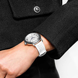 Cl Classics Manchette — это решительный аксессуар: при взгляде первым бросается скульптурный браслет с орнаментом Clou de Paris, который играет бликами и превращает часы в украшение. Мини-циферблат выдержан в строгой минималистичной манере — только часы и минуты — чтобы ничто не отвлекало от фактуры и формы браслета.