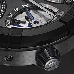• Функции: часы, минуты, малая секунда, GMT (ретроград), день недели (ретроград), дата (ретроград)