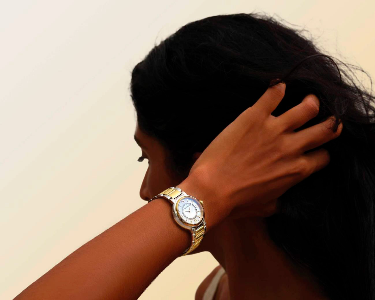 • AIKON Quartz 35mm Duotone с перламутровым циферблатом и бриллиантовыми индексами идеально подходит для особых случаев, добавляя нотку роскоши в повседневный стиль.
