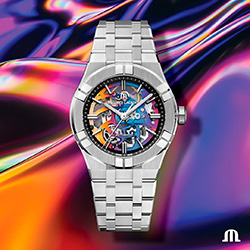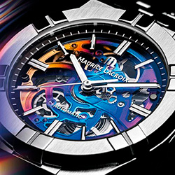 Для TimeForArt Maurice Lacroix создал уникальную вещь, используя механизм скелета в качестве художественного полотна, обогащенного множеством оттенков. Люминесцентные часовая и минутная стрелки, а также тонкая центральная секундная стрелка плавают над сапфировым циферблатом и взаимодействуют с люминесцентными индексами для указания преобладающего времени.