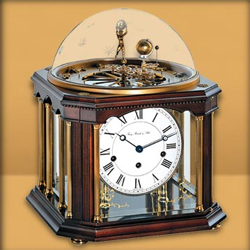 Изящная модель настольных часов, в верхней части которых расположена миниатюрная модель солнечной системы. Корпус из ореха украшают декоративные колонны, эмалированный циферблат со стрелками в стиле Бреге, стеклянный свод с выгравированными вручную звездами. В центре возвышается фигура могущественного бога Солнца, держащего солнечный диск, а рядом Земля и Луна. На диске вокруг планетной группы отображаются дата, месяц и астрологический календарь, состоящий из 12 знаков Зодиака, выполненных в форме изящных фигурок.