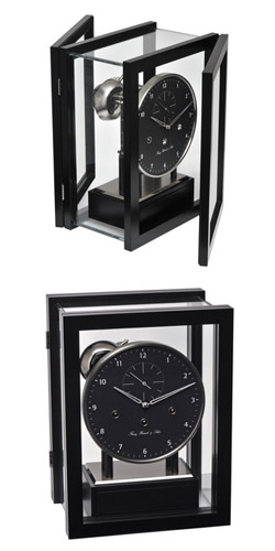 Элегантный тросовый механизм расположен в корпусе из черного лакированного дерева и покрыт кольцеобразным стеклом; в отделке задней стенки используется кап орехового дерева. Часы имеют черный металлический циферблат, хромированные ободок, маятник и встроенный ящик для заводного ключа.