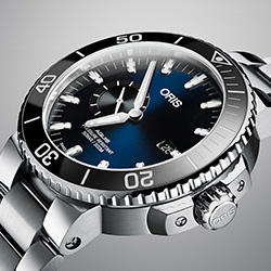 Изменения принесли часам не только более динамичный вид. Дизайнеры Oris предусмотрели небольшой промежуток между ободком и корпусом, благодаря чему ободок стало более удобно удерживать и поворачивать. Этот дизайн – отражение высокофункционального характера часов. Модель Aquis Small Second, Date оснащена вращающимся в одном направлении ободком с вставленным в него нецарапающимся и невыцветающим керамическим кольцом. Водостойкость часов до 500 метров (50 атм.).