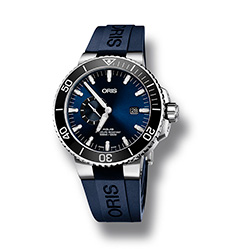 - Синий или черный каучуковый ремешок с разработанным Oris предохранительным якорем и раскладывающейся застежкой со скользящим устройством настройки длины ремешка.