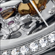 Корпус эффектных и оригинальных часов «Artelier Skeleton Diamonds», диаметром 31 мм, выполнен из стали. Он имеет классическую круглую форму, а его серебристый рант инкрустирован 56-ю бриллиантами общим весом 0,5 карата. Драгоценные камни, имеющие круглую огранку, служат не только для украшения часов. На внешнем кольце циферблата, покрытым изысканным гильоше, находятся десять бриллиантов (общим весом 0,048 карата), которые выполняют функции часовых меток.